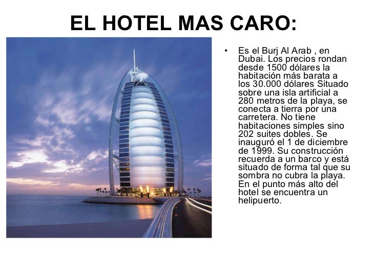 23 500 dólares por noche. El hotel burj al arab jumeirah forma parte del top 3 de la lista de los hoteles más caros del mundo. Cuál es el hotel más caro del mundo. También es el más alto y uno de los más caros del planeta.