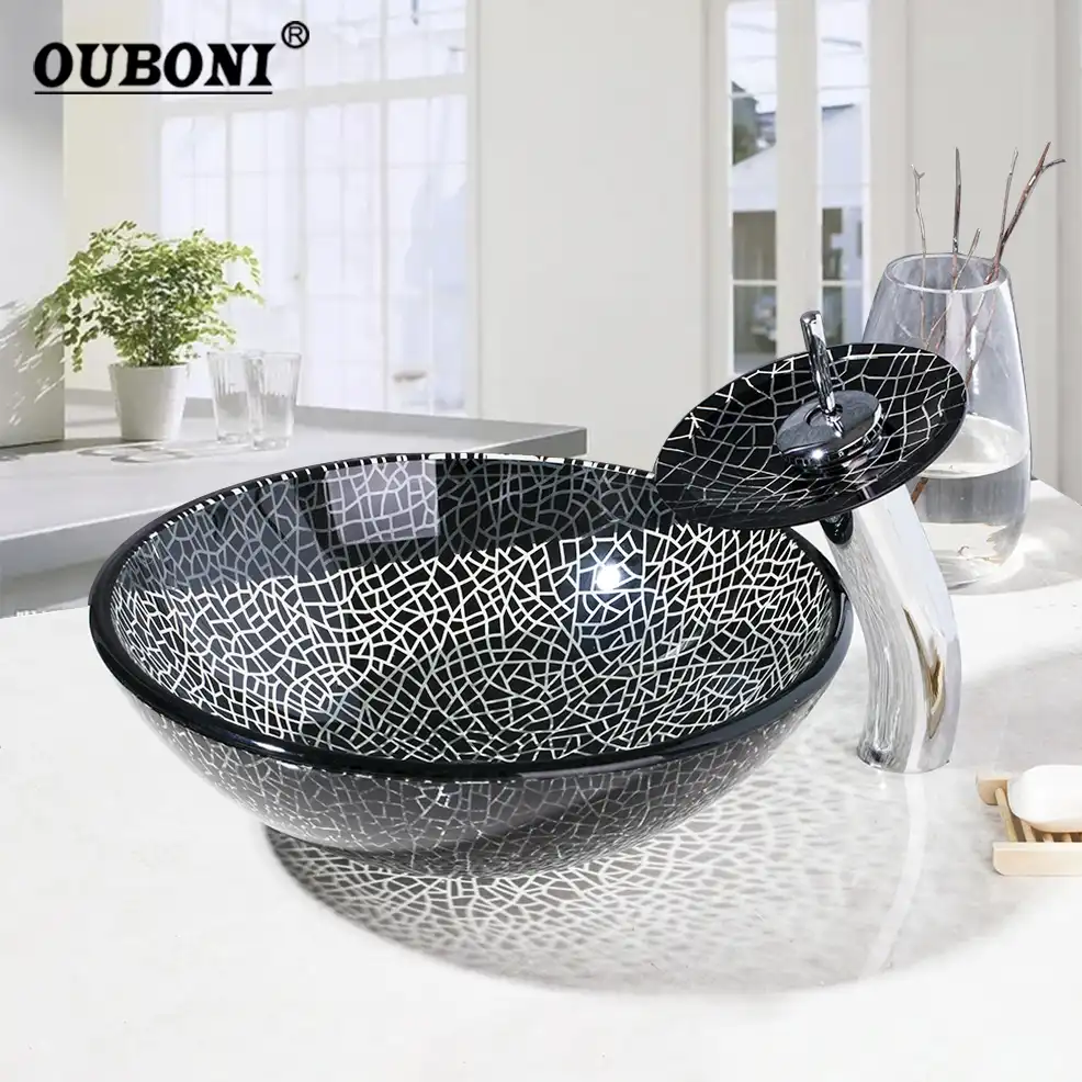 ouboni siyah kirik yuvarlak banyo el yapimi makale lavabo temperli cam gemi lavabo selale krom pirinc musluk seti