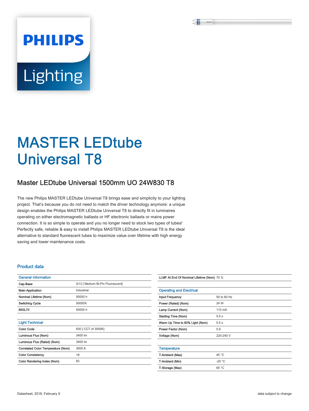 master ledtube vle 1200mm uo 16w 840 t8