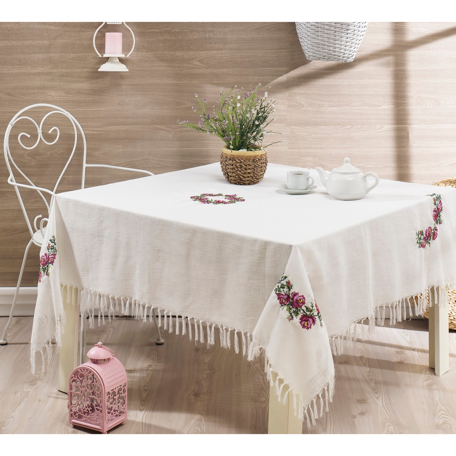 koton beyaz ince yaprak nakisli kare masa ortusu