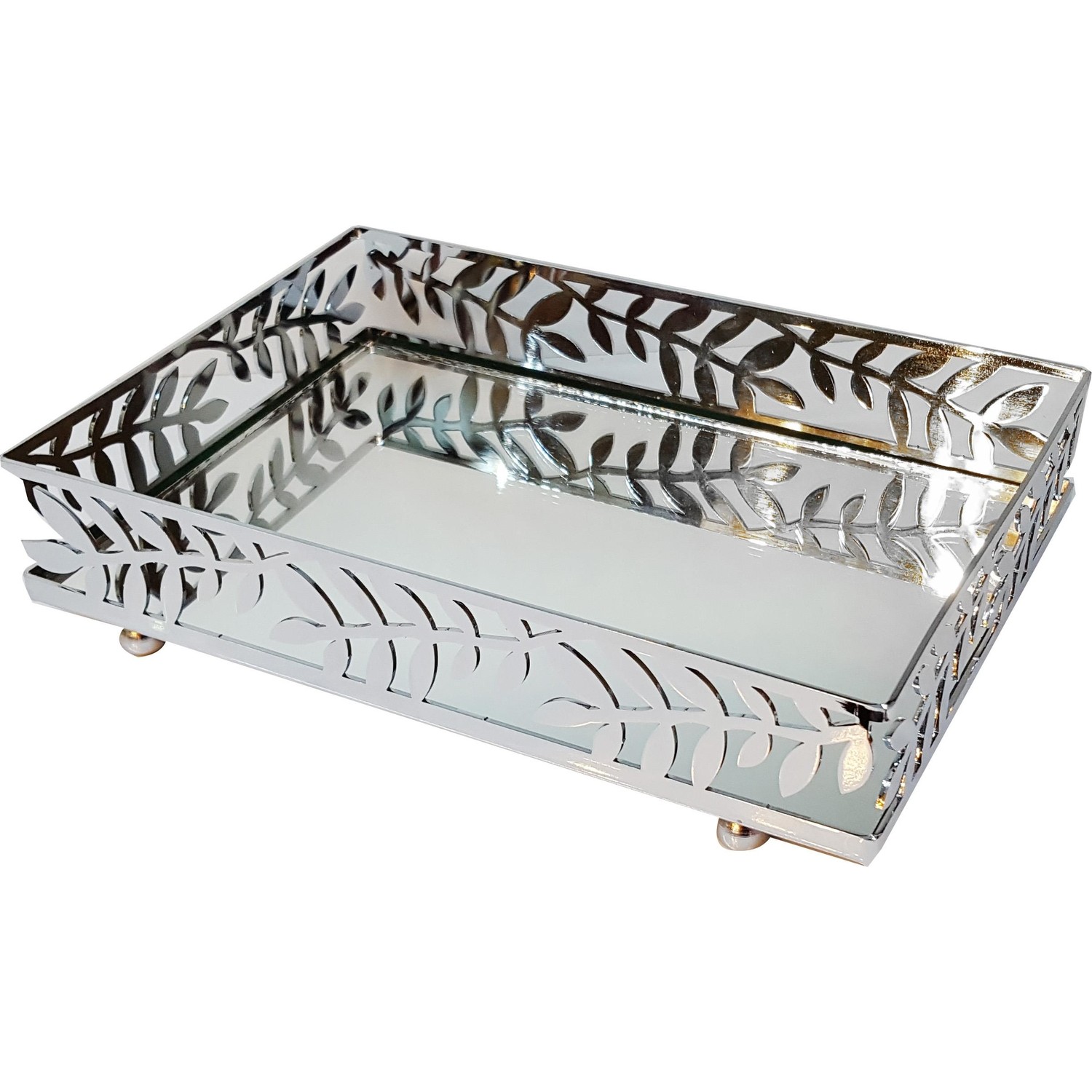 oyks yaprak motif aynali metal tepsi krom renk 30 x 22 cm