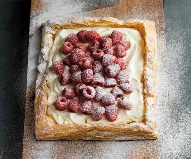 tabuleiros de massa folhada com ovos moles e framboesa