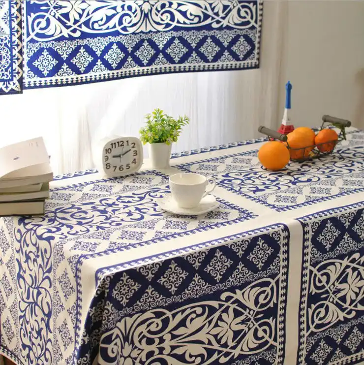ev tekstili buyuk mavi ve beyaz masa ortusu pamuk keten dantel masa ortusu yemek masa ulke tarzi cicek baski bez icin