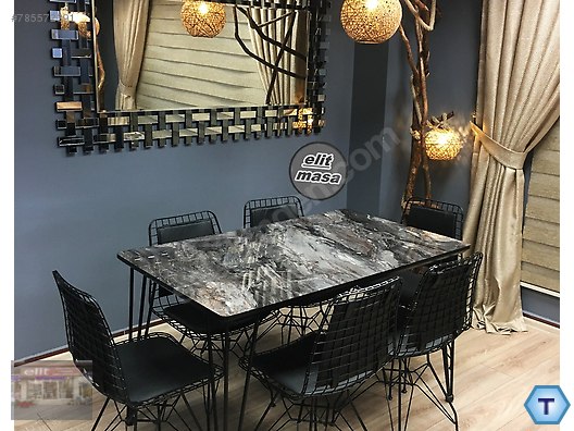Siyah mermer desen ahşap masa takımı metal ayak.